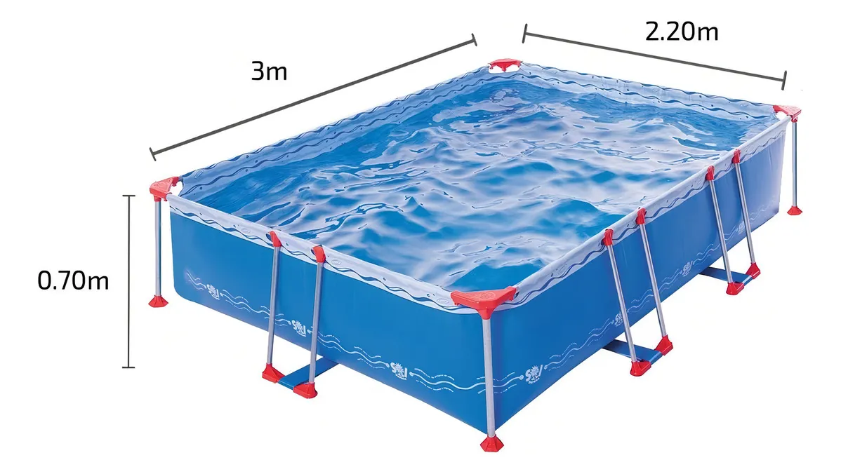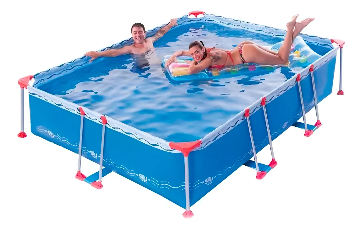 Con un atractivo color azul, esta pileta rectangular está fabricada con lona de alta calidad y cuenta con un armazón de metal galvanizado, garantizando durabilidad y resistencia.