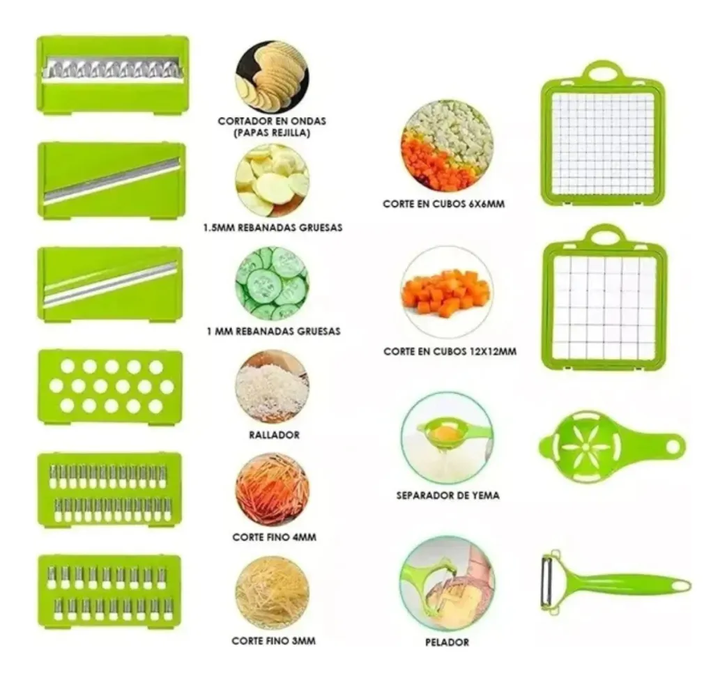 Con 12 piezas intercambiables, ofrece una versatilidad única en la cocina. Sus cuchillas de acero inoxidable de alta precisión aseguran cortes uniformes y limpios, ideales para frutas, verduras, quesos y más. Su estructura en plástico ABS de grado alimenticio proporciona resistencia, seguridad y una larga vida útil.