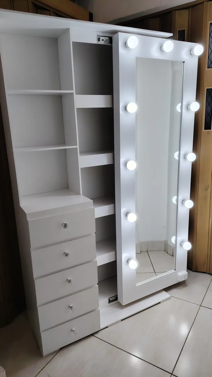 Un espejo de pie tipo tocador con iluminación estilo Hollywood, ideal para vestidores, tocadores o espacios de belleza. Su formato vertical y los focos en el contorno ofrecen una iluminación uniforme y favorecedora para maquillar, peinarse o simplemente decorar con estilo.