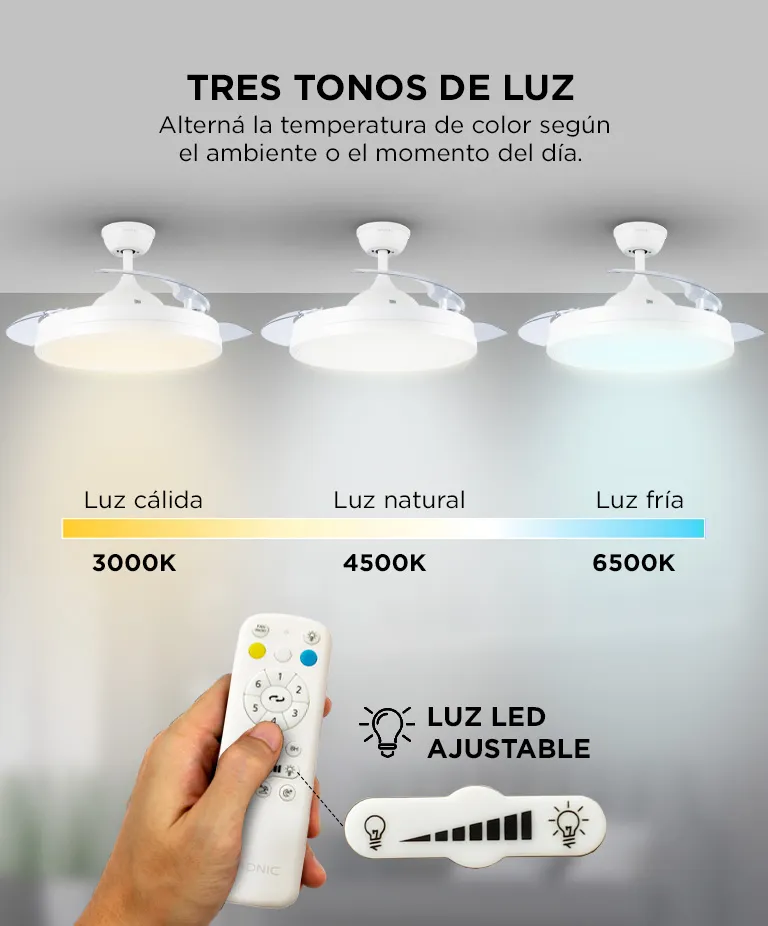 • Luz integrada de 80W y selector de temperatura (Fría – Neutra – Cálida).